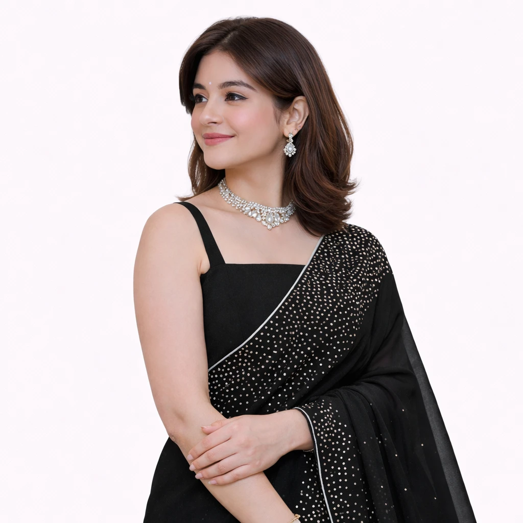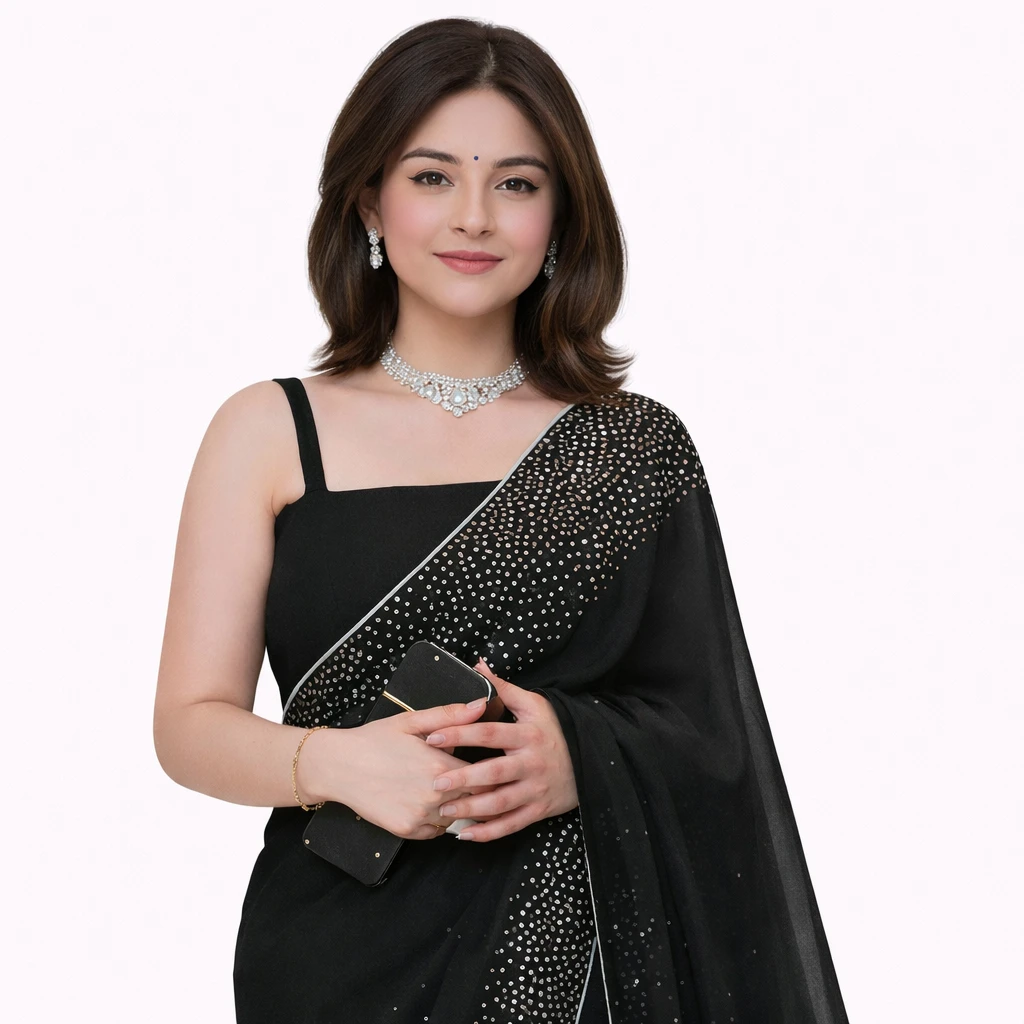 This Women's Hot Fixing Poly Georgette Saree exudes elegance with its intricate hot-fix detailing. The lightweight Poly Georgette fabric ensures comfort, while the vibrant design adds a touch of glamour. Paired with an Unstitched Art Silk Blouse Piece, the ensemble is versatile and stylish. The rich texture of the velvet complements the saree beautifully. Ideal for special occasions, this ensemble effortlessly combines traditional and contemporary elements, making it a stunning choice for those who appreciate timeless fashion.|Hot Fixing Ply Georgette Saree|Women's Blouse Piece|Georgette Fabric|